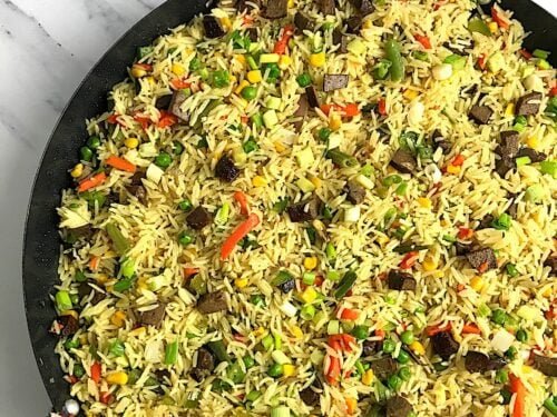 A big pan of Adun Fried Rice, This dish combines perfectly cooked long-grain rice with sautéed onions, bell peppers, carrots, sweet corn, and green peas — all tossed in a savory mix of curry, thyme, and rich seasoning for that authentic party flavor. Lightly stir-fried to perfection, each grain shines with color, aroma, and a hint of smokiness.